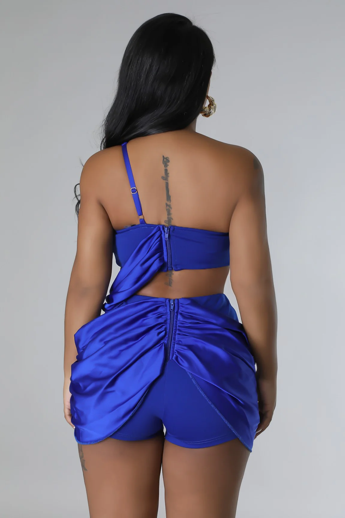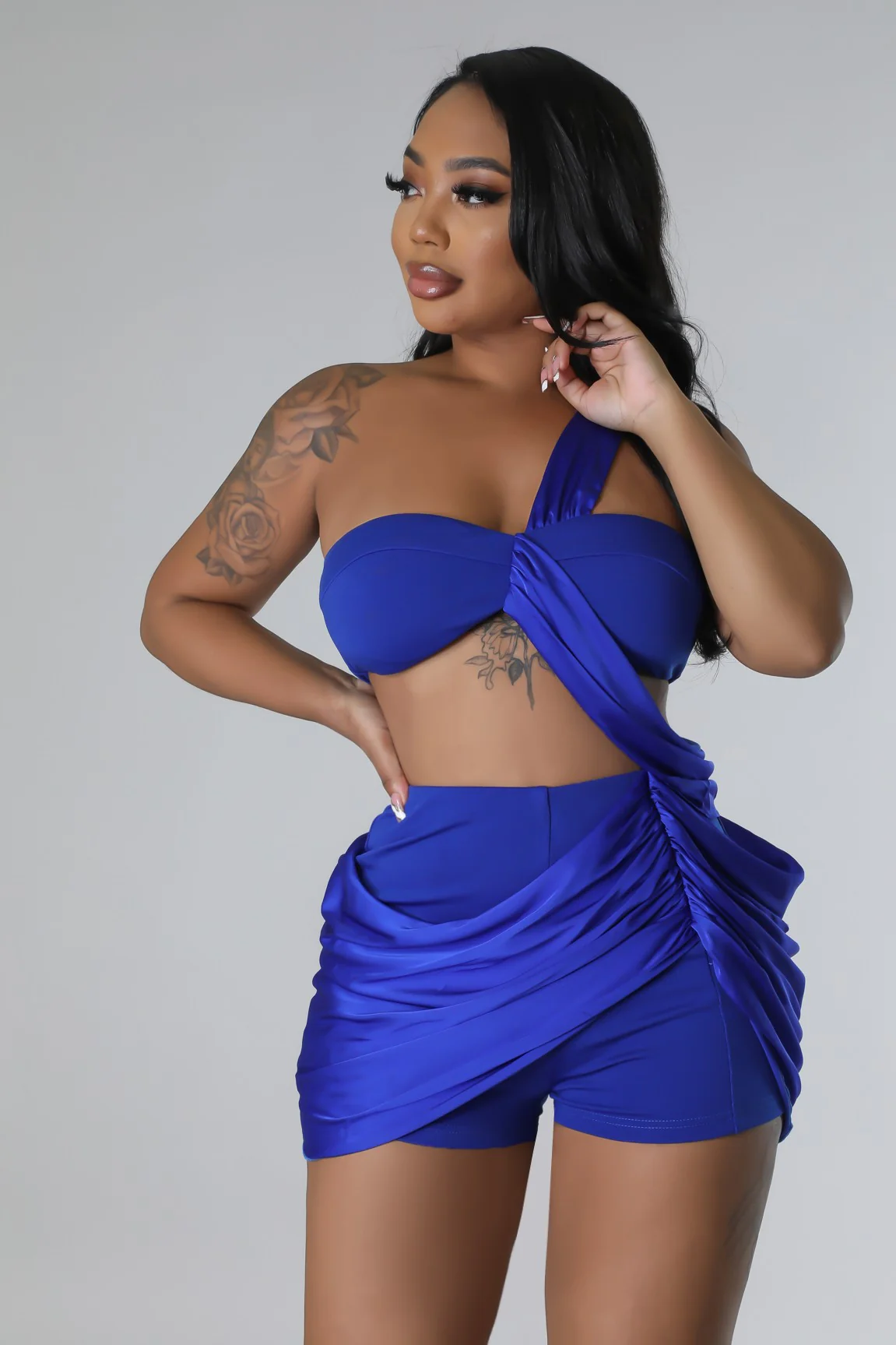 L’ensemble Blue Obsession est la pièce pépite qui sublime instantanément la silhouette. Son haut asymétrique au drapé croisé met en valeur la poitrine, tandis que le bas effet jupe avec short intégré sculpte les formes avec élégance et confort.