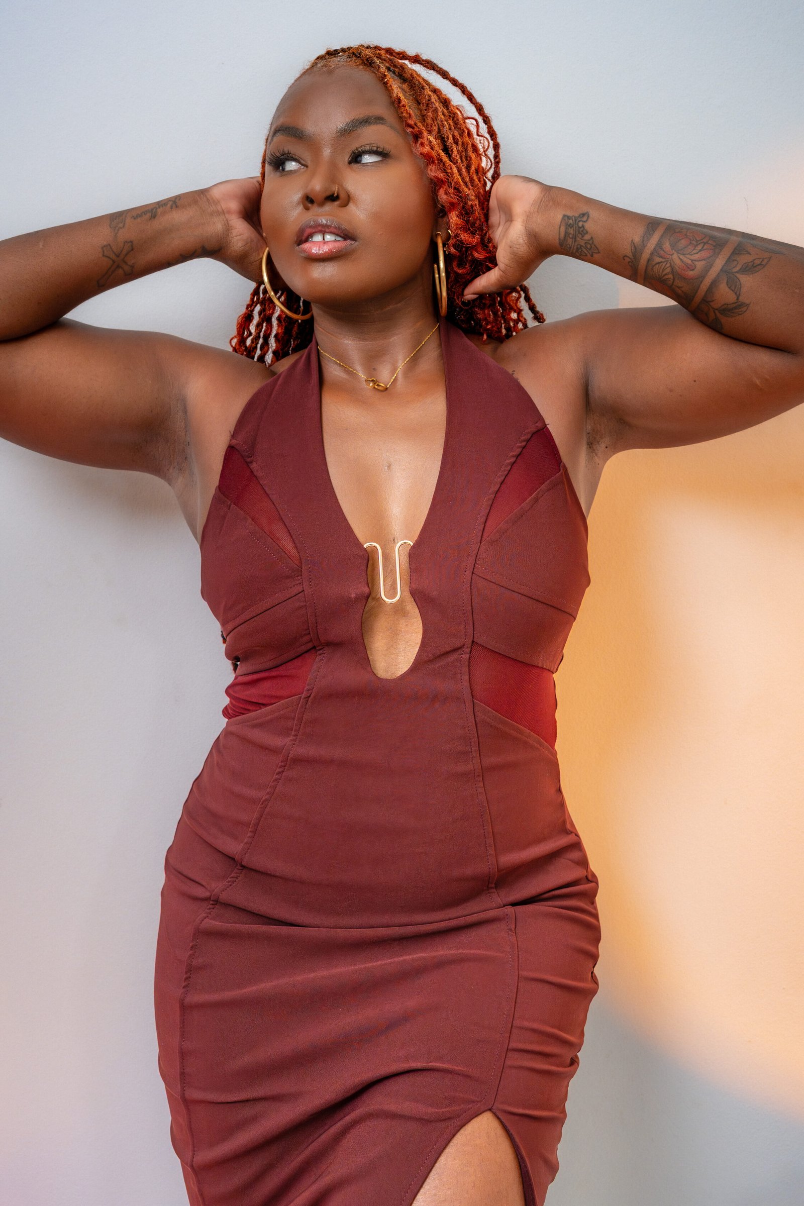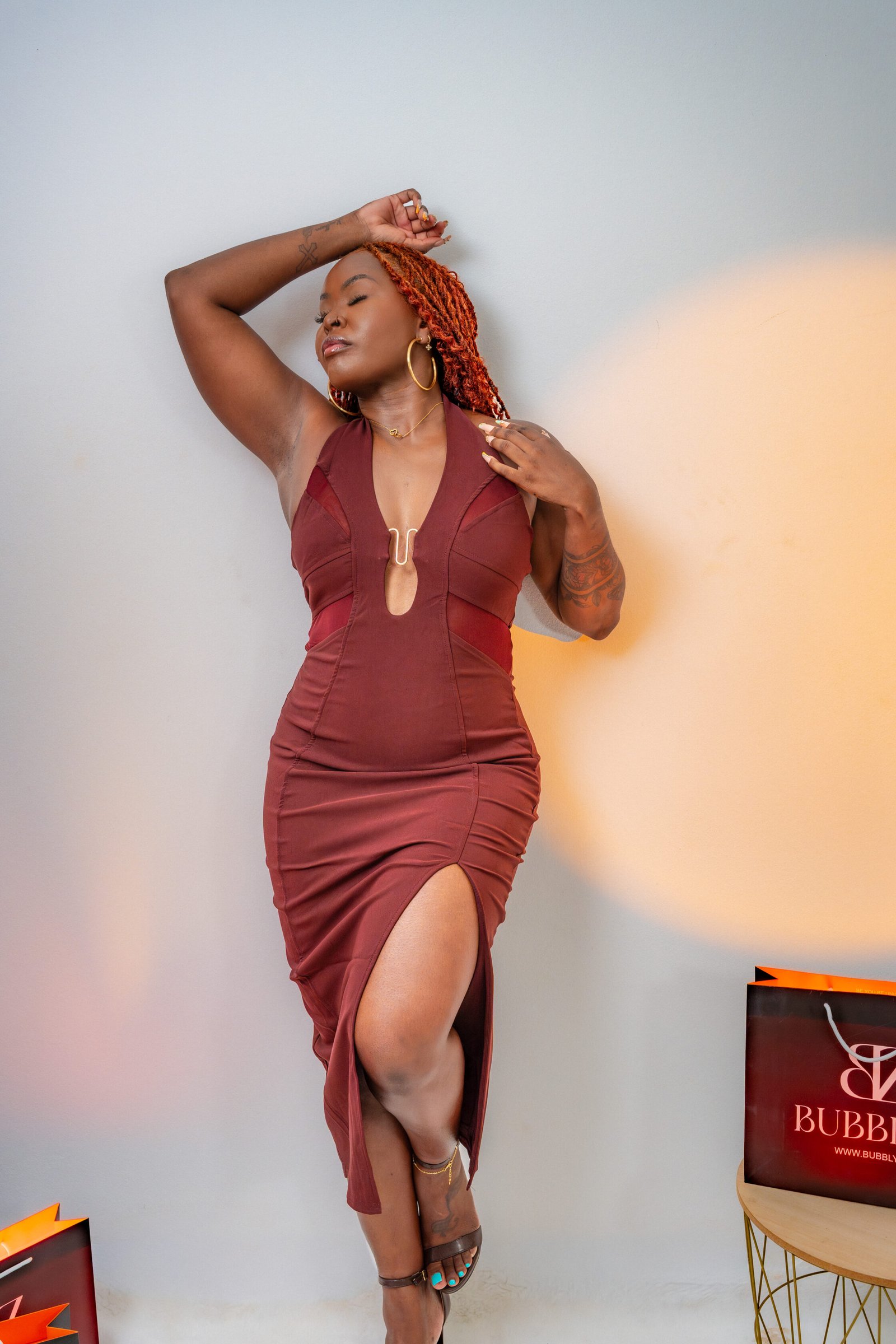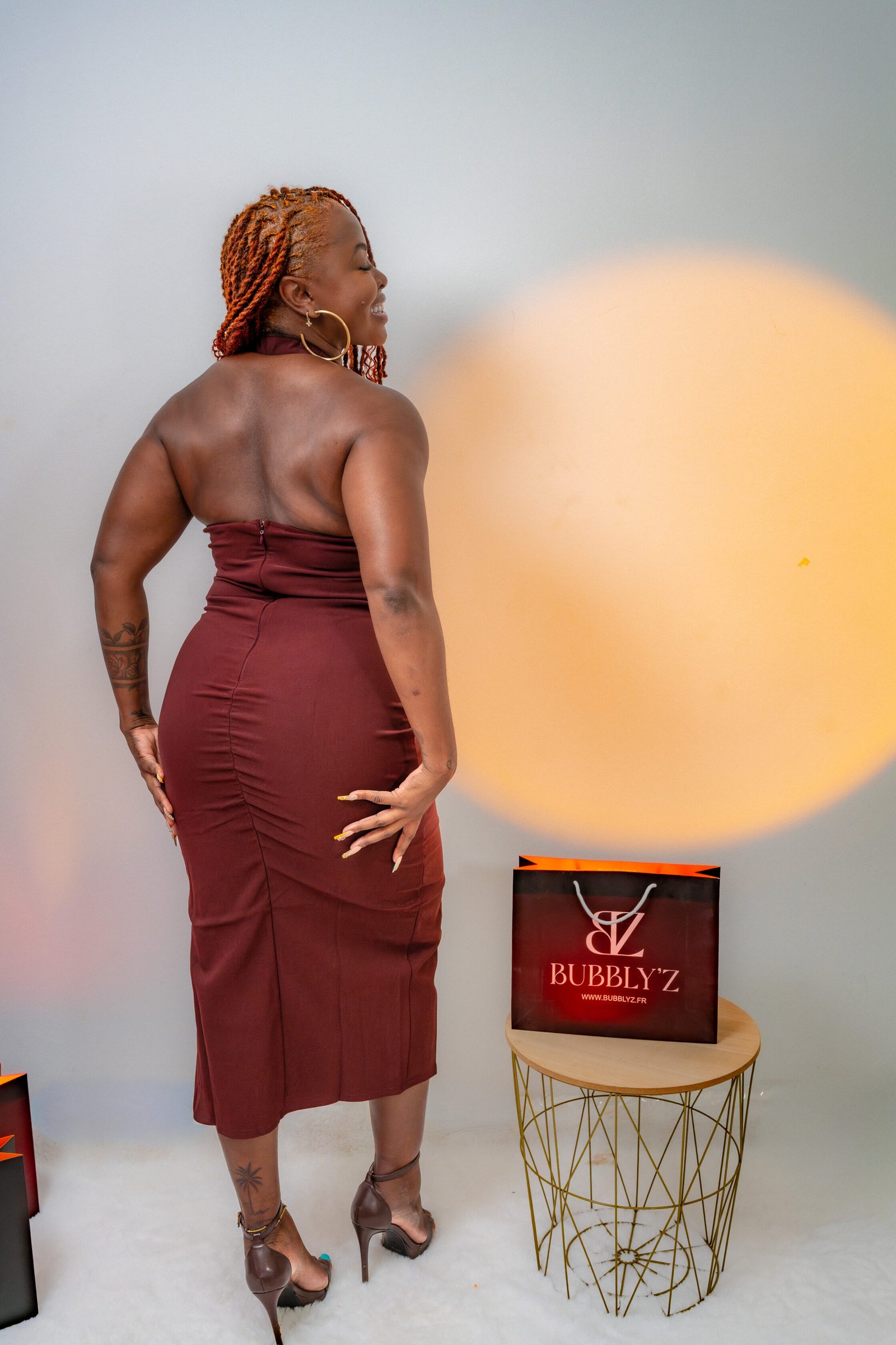 Cette robe midi dos-nu à encolure américaine incarne l’élégance et la féminité. Son décolleté en goutte rehaussé d’un détail métallique apporte une touche sophistiquée, tandis que la coupe moulante épouse parfaitement les formes.