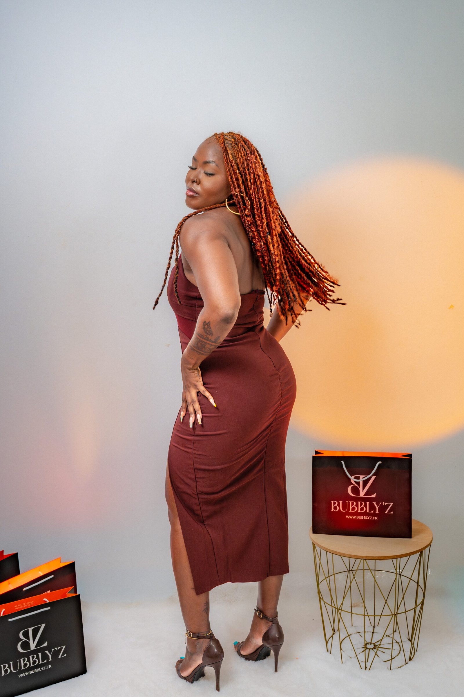 La fente latérale offre une allure sensuelle tout en facilitant le mouvement. Confectionnée dans un tissu extensible et confortable, cette robe est idéale pour une soirée, un événement ou une occasion spéciale. Une pièce forte qui allie style, confort et modernité.